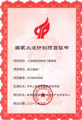 国家火炬计划项目证书“大型精密的轿车门板模具”